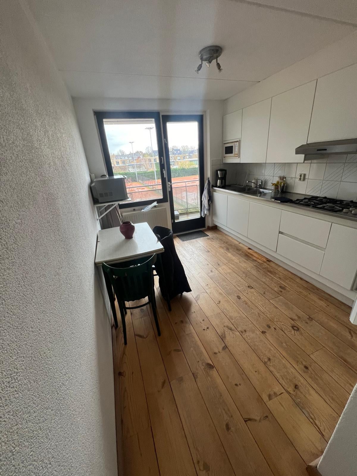 The kitchen is equipped with a gas hob, combination microwave and fridge-freezer and has a spacious balcony with a nice view at “Tenniscourt Kralingen”.
