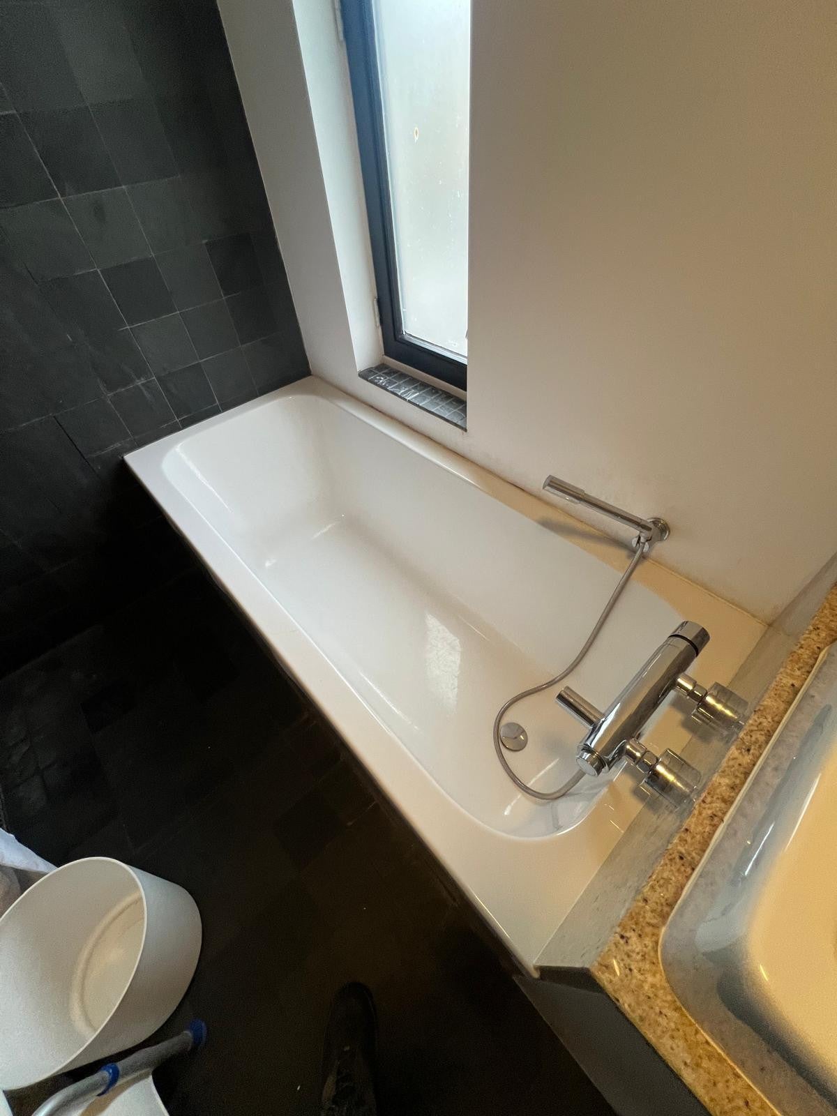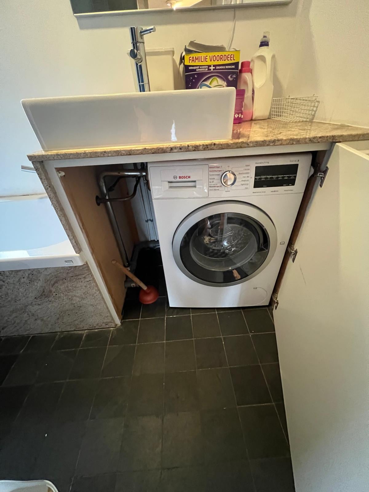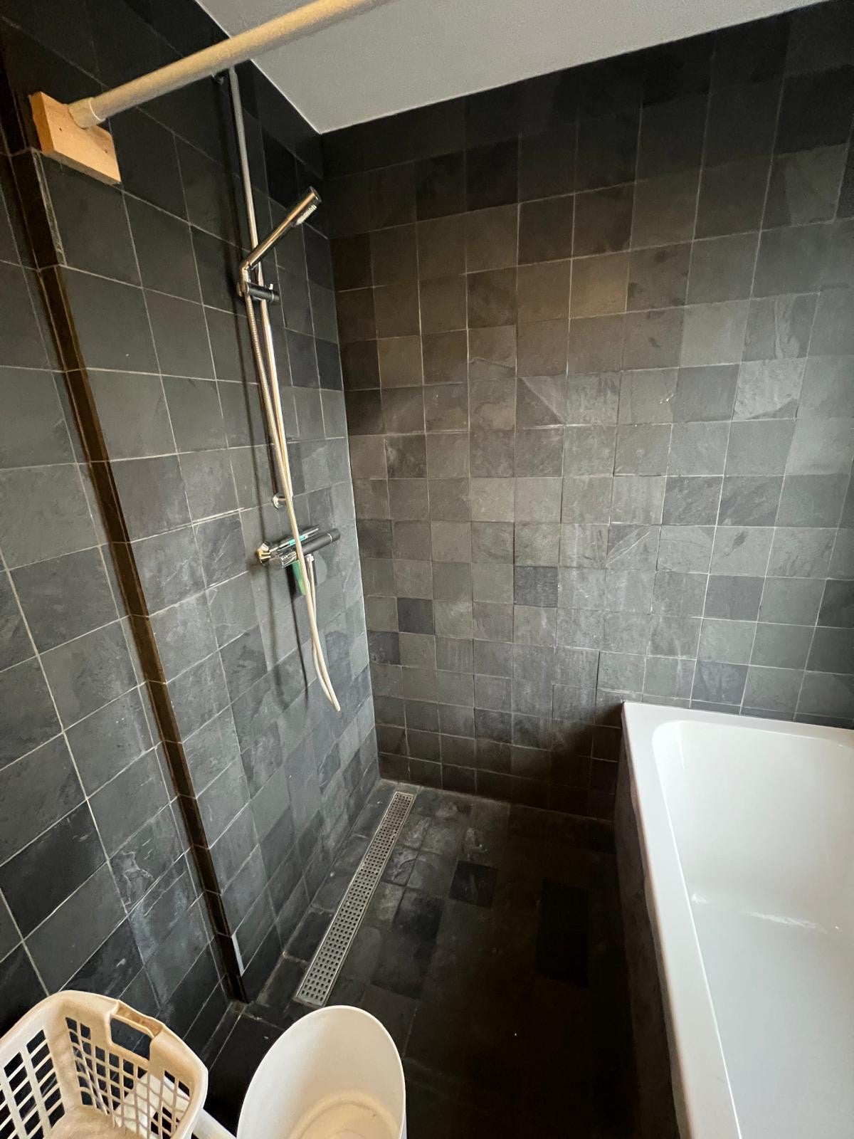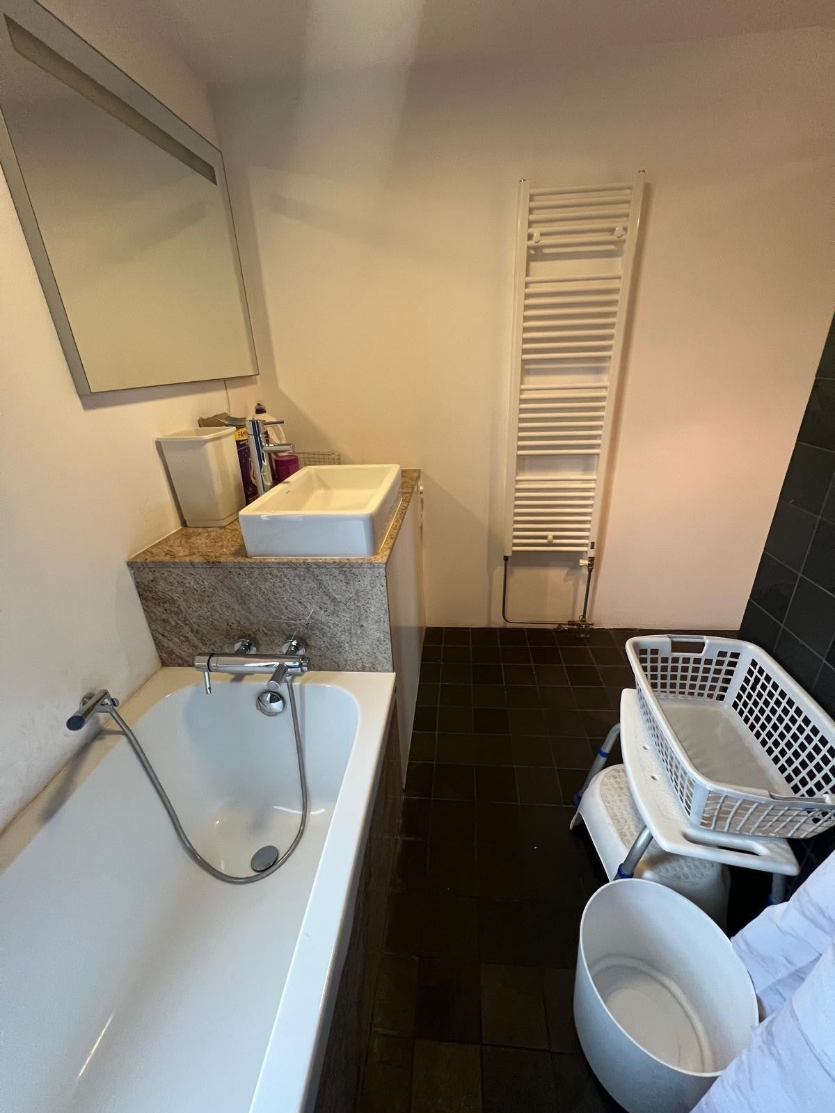 Ligbad, inloopdouche, wastafelmeubel, wasmachineaansluiting