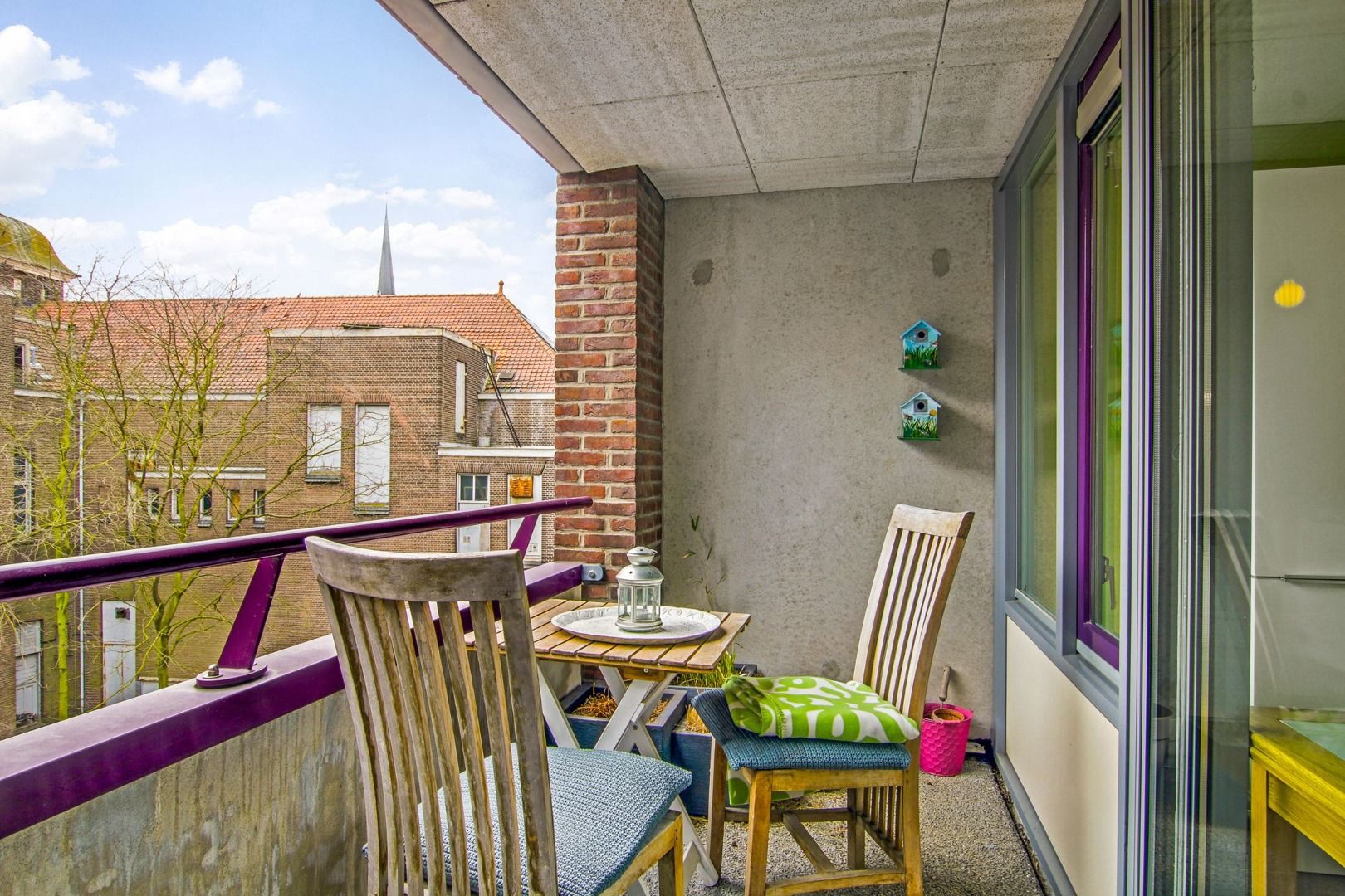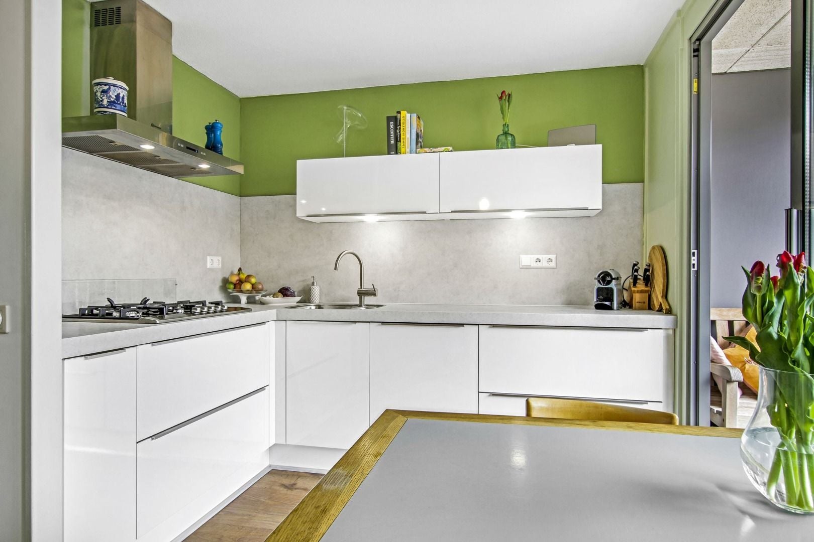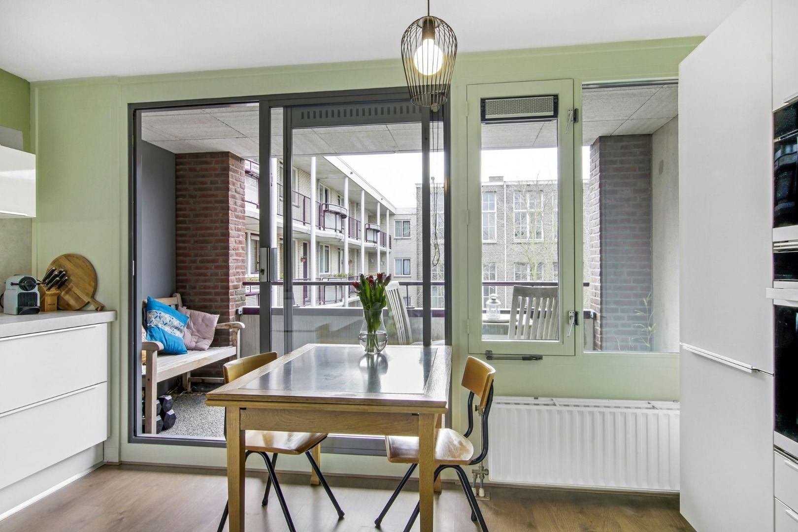 aan de achterzijde is de ruime keuken. De keuken van ruim 10 m2 is zo opgesteld dat je een groot werkblad hebt met een 5-pits gaskookplaat, de vaatwasser, veel bergruimte en een niet al te hoge dubbele bovenkast, wat een ruimtelijk gevoel geeft. Daar tegenover zijn 3 hoge kasten geplaatst met de koelkast en vriezer, de oven, magnetron en nog meer bergruimte. Er is ruimte genoeg voor een tafel om lekker aan te eten en met de toegang tot het balkon is dit misschien wel de fijnste ruimte van dit appartement! Het balkon heeft uitzicht over de gemeenschappelijke binnentuin.