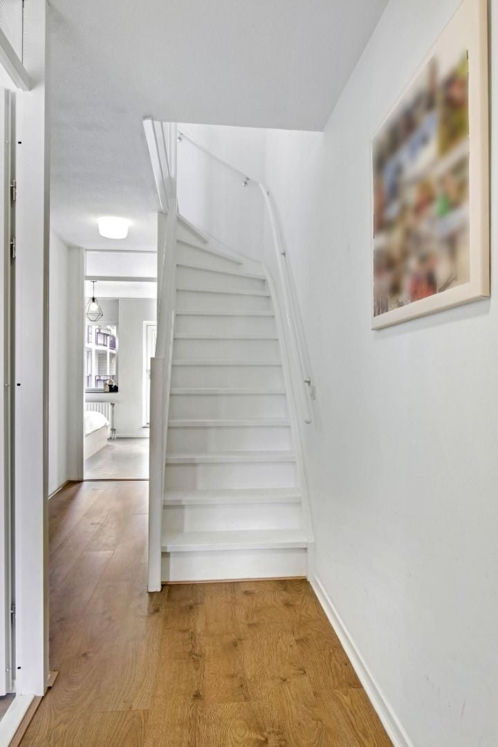 op de begane grond bevindt zich het bellentableau met de brievenbussen, de lift en de trap naar boven. Op de tweede verdieping aangekomen lopen we de hal van het appartement binnen. In dit appartement is onderste (2e) verdieping de slaapverdieping en de bovenste (3e) de woonverdieping. Hoe hoger je komt, hoe lichter, dus dat is heel erg fijn!