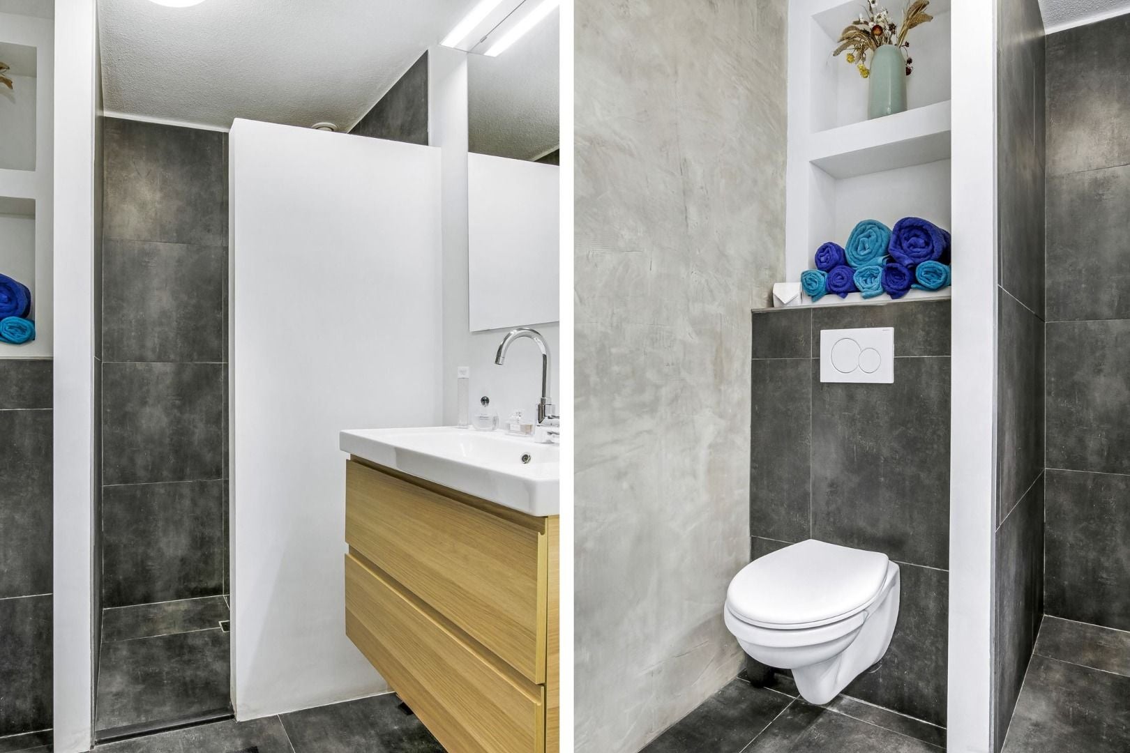 tussen de 2 slaapkamers ligt de moderne badkamer voorzien van een ruime inloopdouche, een grote wastafel met zwevend wastafelmeubel en mooie grote spiegel met ingebouwde verlichting. Tevens bevindt zich in de badkamer het eerste toilet. In de hal is nog een ruime extra bergkast onder de trap.